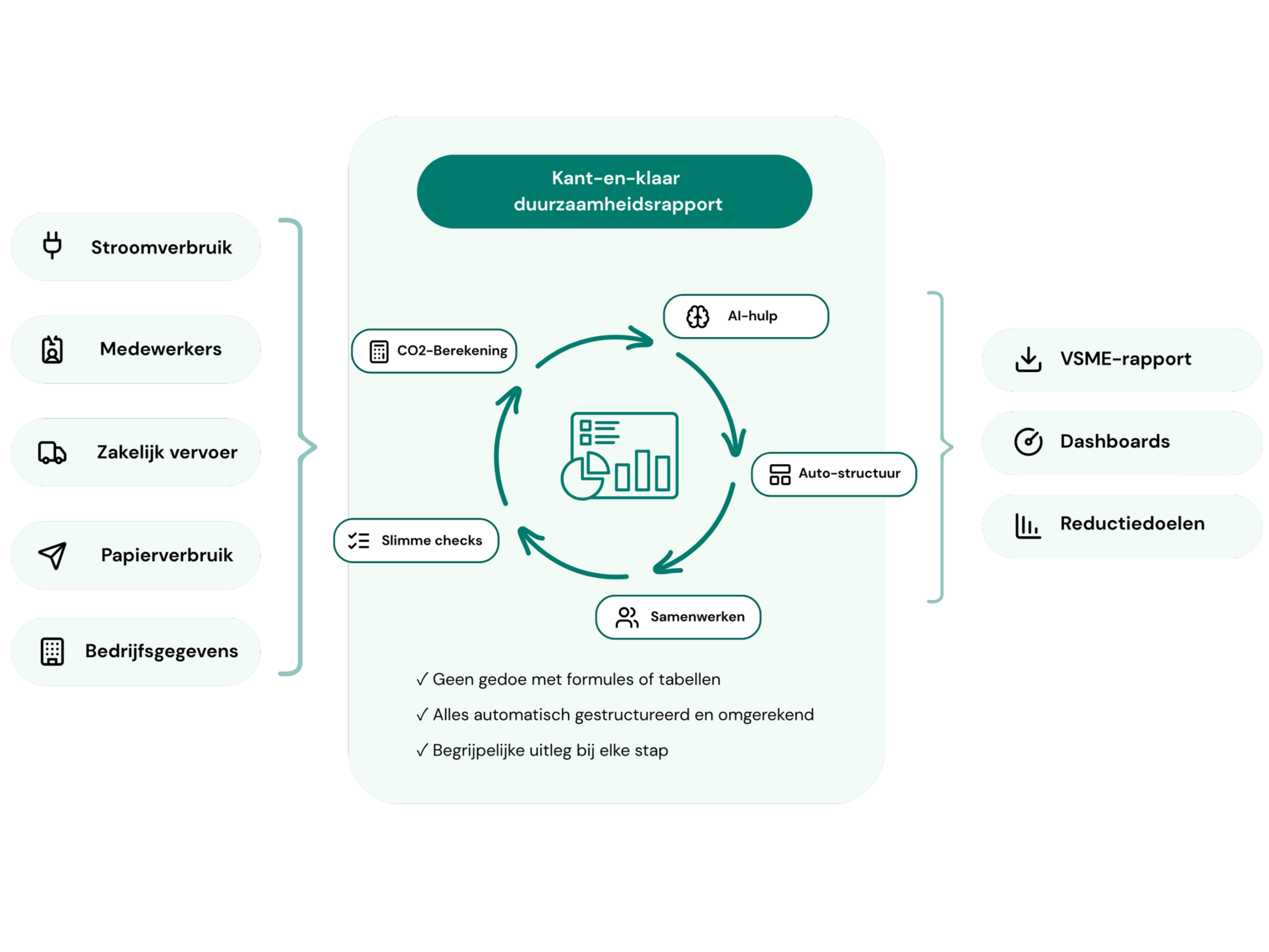 Bouw zonder voorkennis een compleet duurzaamheidsrapport, bereken automatisch je CO2-uitstoot en download een kant-en-klaar VSME-proof verslag – al gebruikt door tientallen mkb-bedrijven voor aanbestedingen, vragen van klanten en interne ESG-doelen.